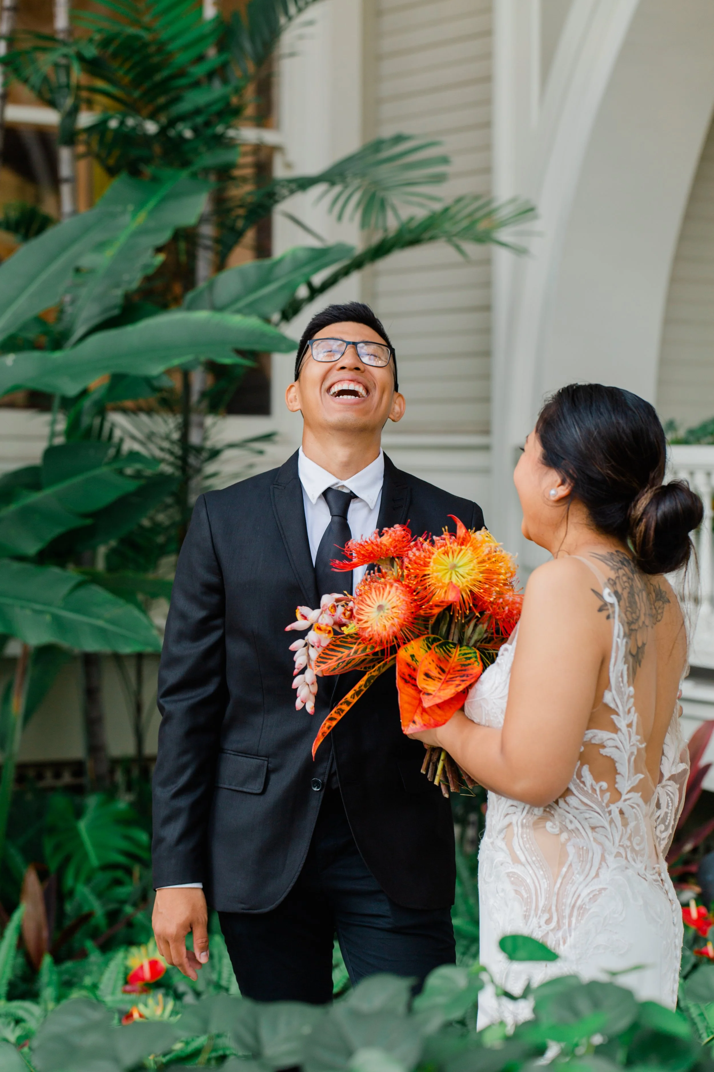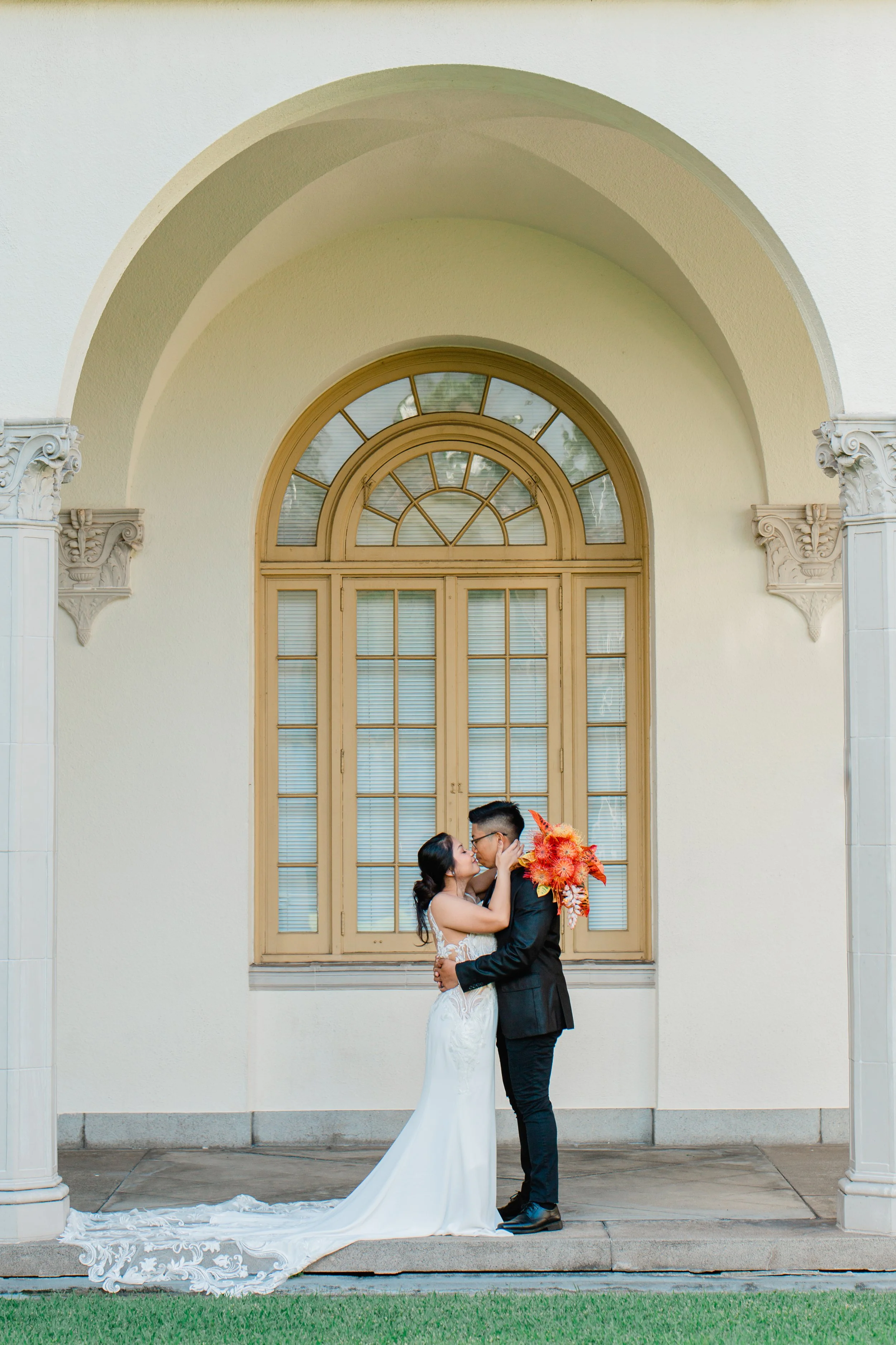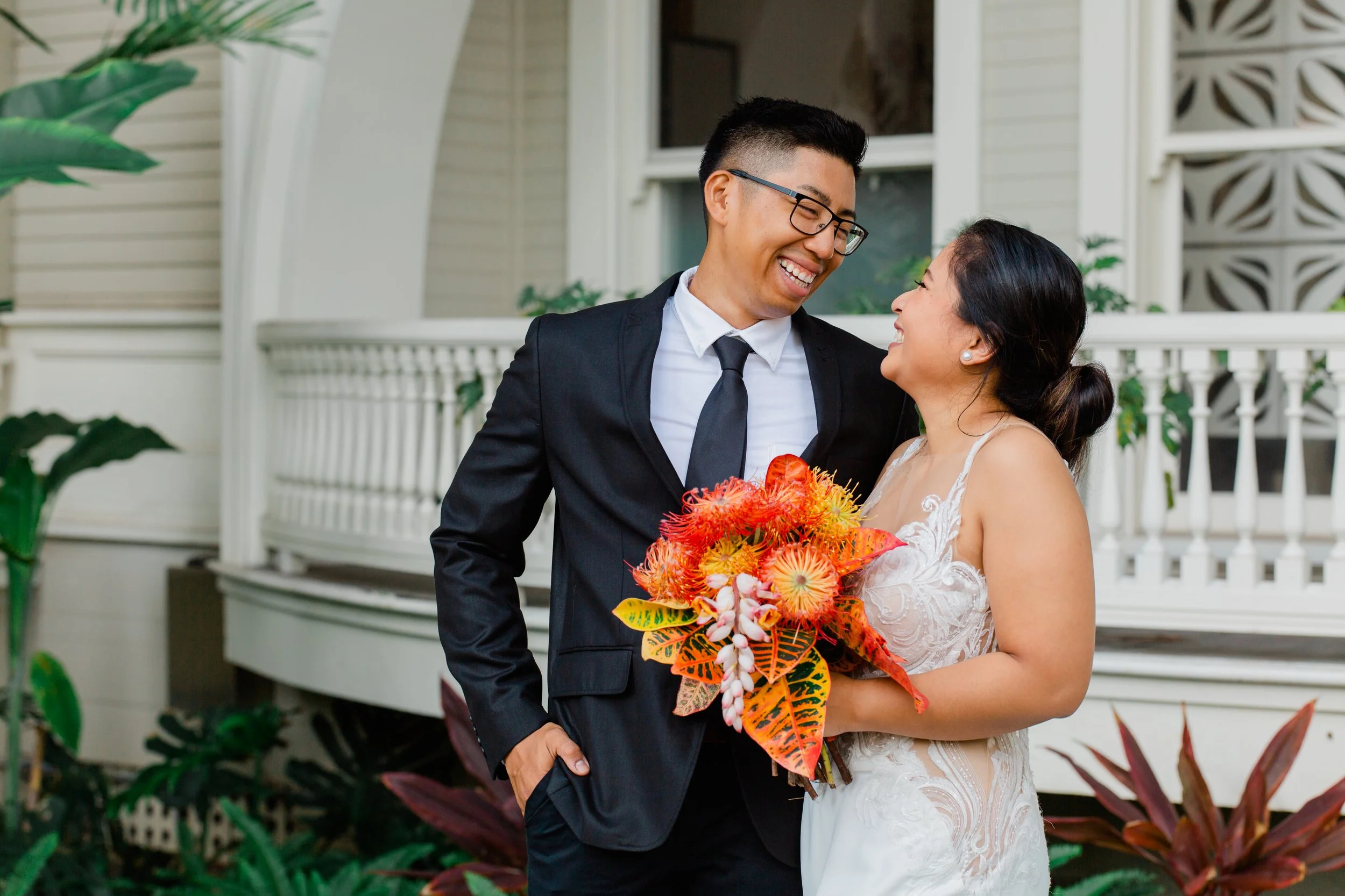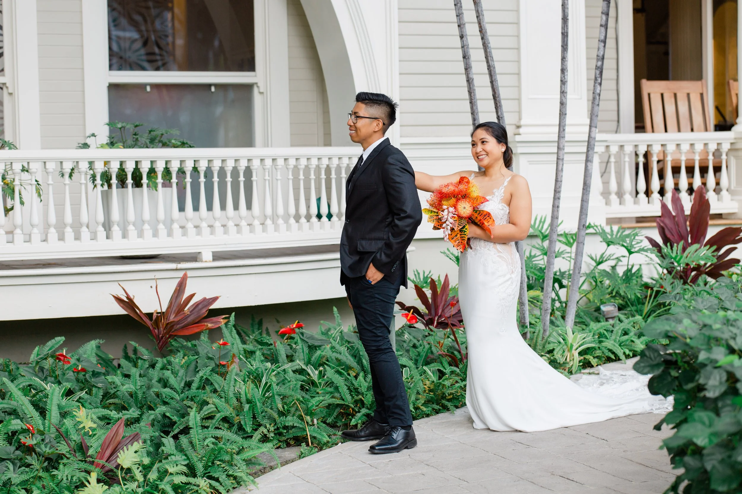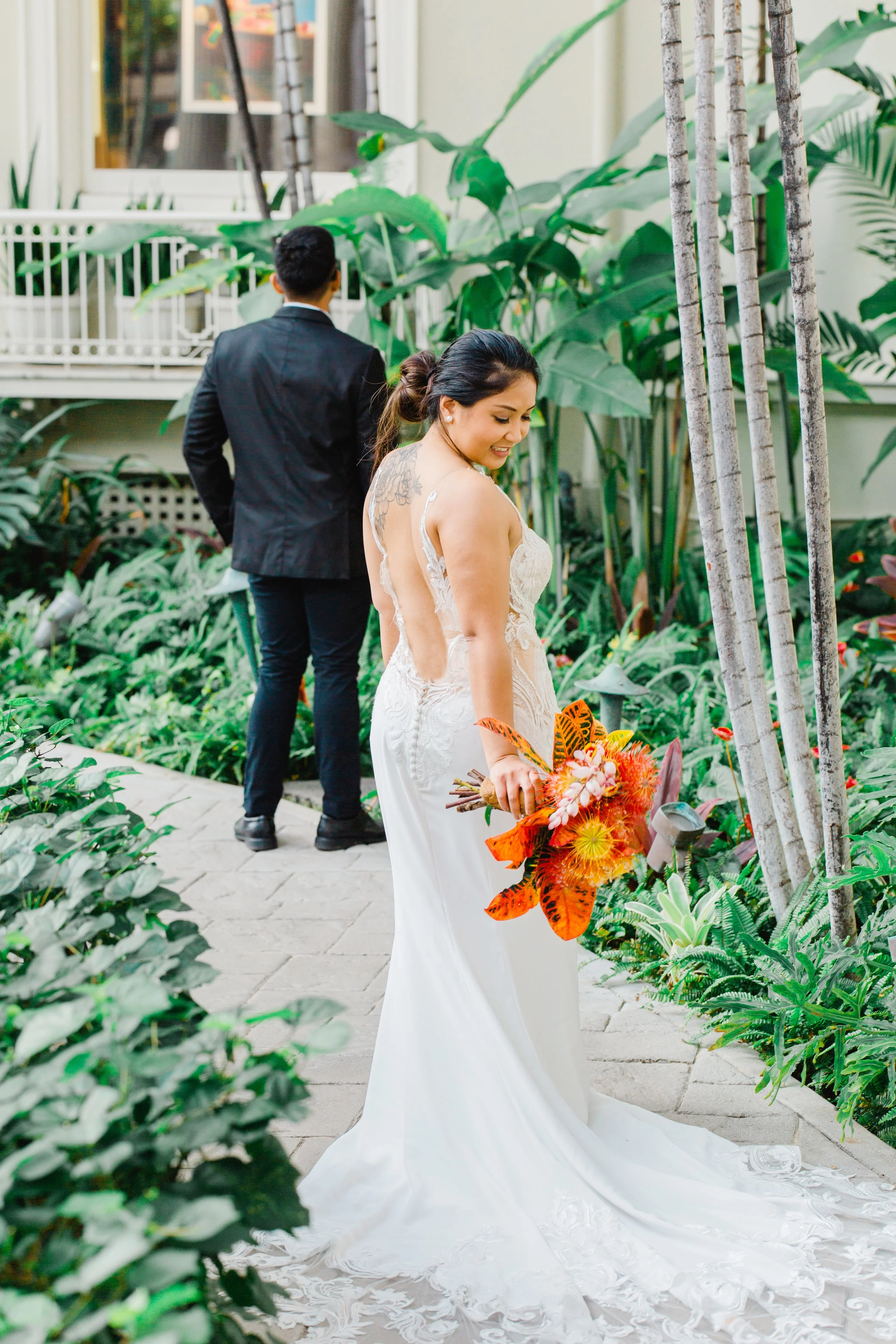 We met up with Ger & Jamaica on the most beautiful day, a classic Oahu morning in downtown Honolulu. She looked absolutely stunning in this detailed lace gown and a uniquely modern bouquet.