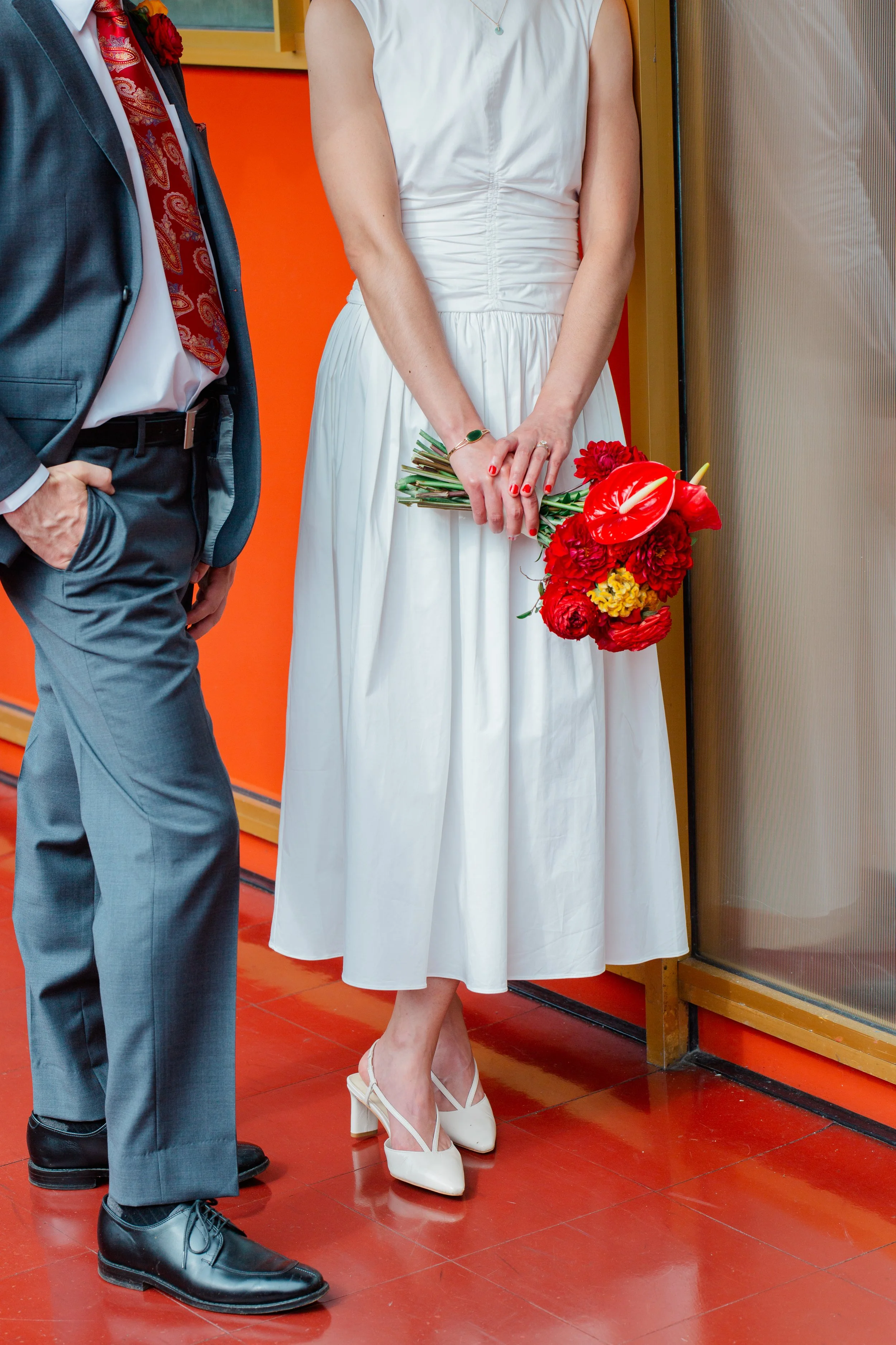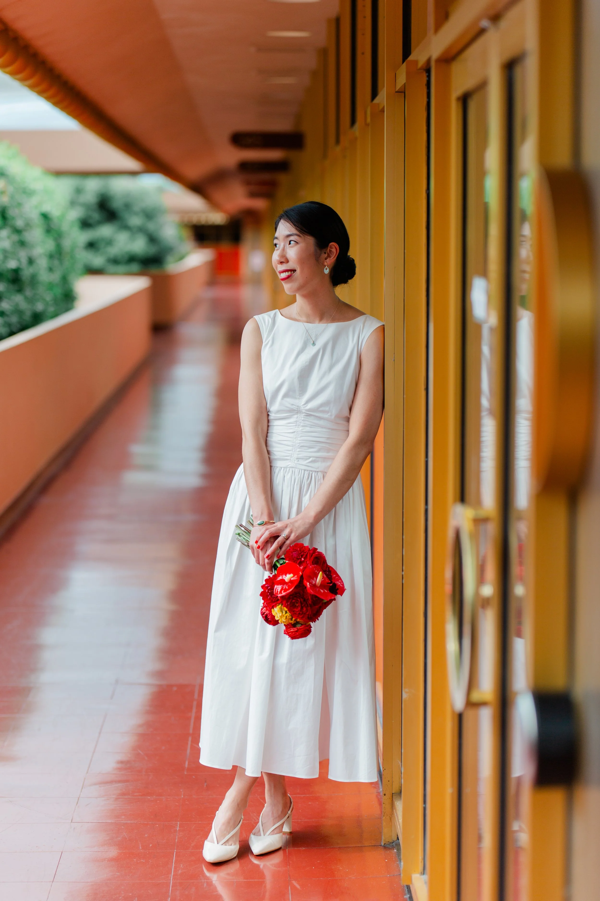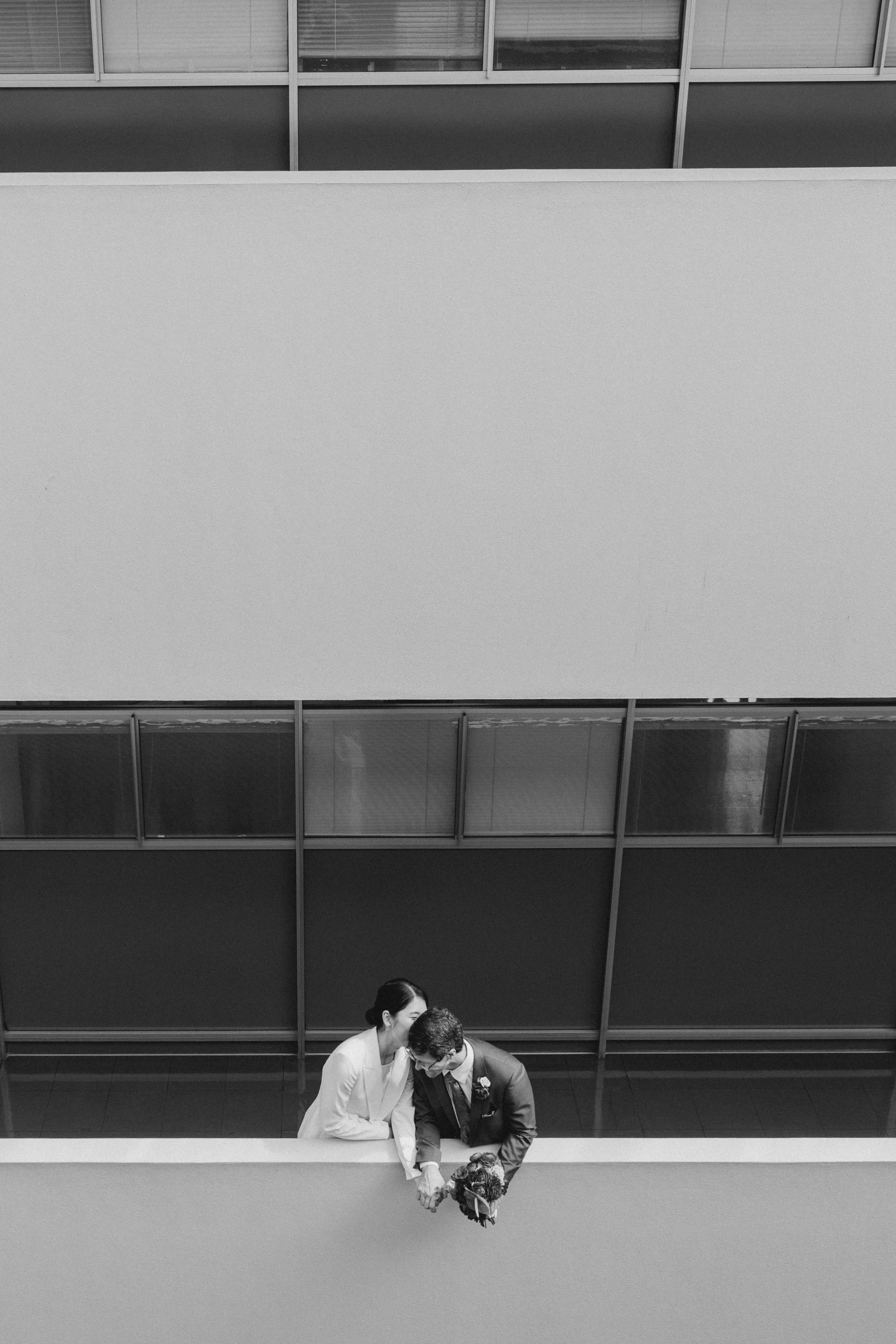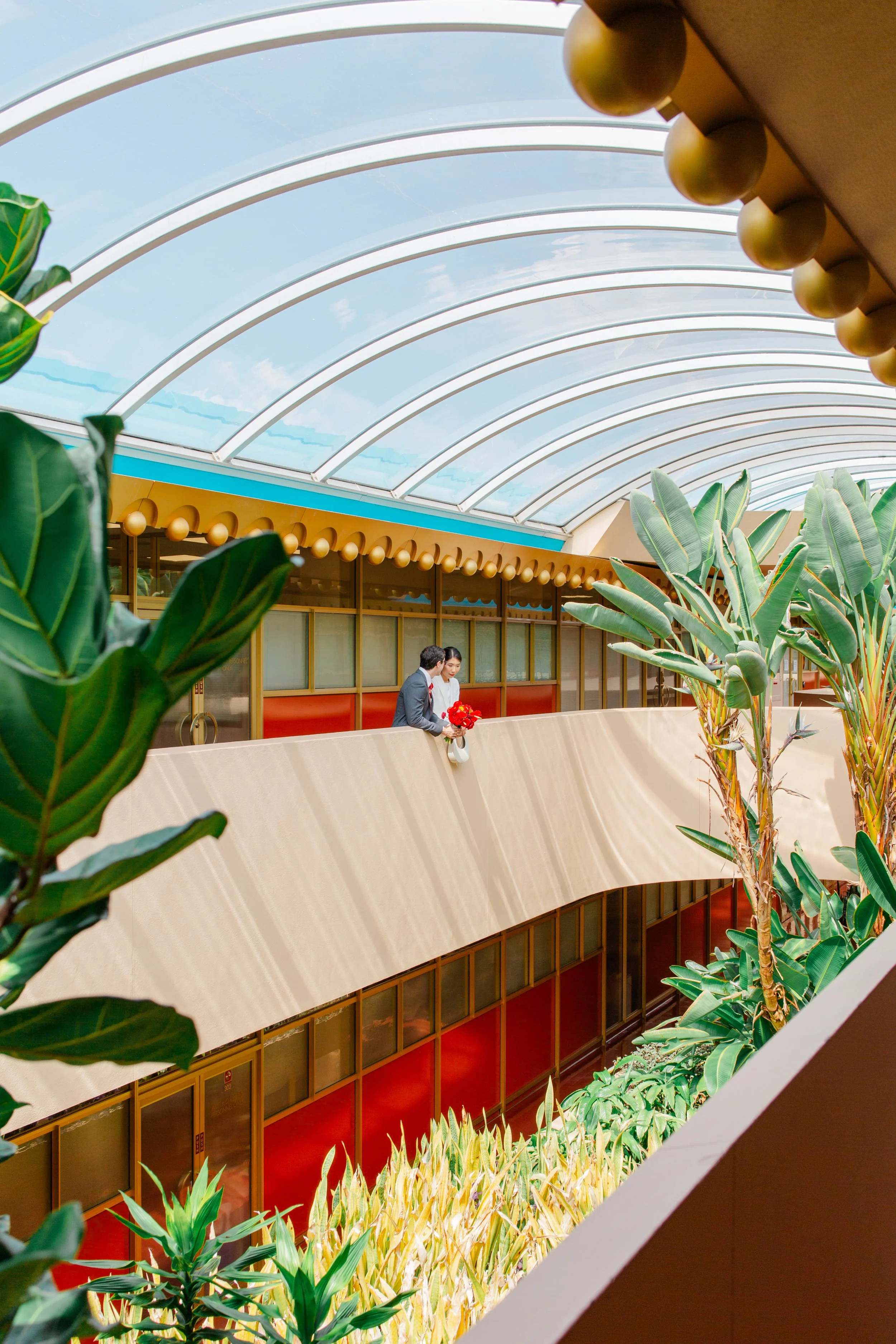 While people busily fill in all the spaces of San Francisco, the long draping hallways of the Marin Center in San Rafael seem frozen in time. Administrative employees will poke their heads out to congratulate you on your nuptials, a library patron will pause to help a groom affix flowers to his lapel, and families will lean over the balconies to catch a glimpse of the stunning couple.